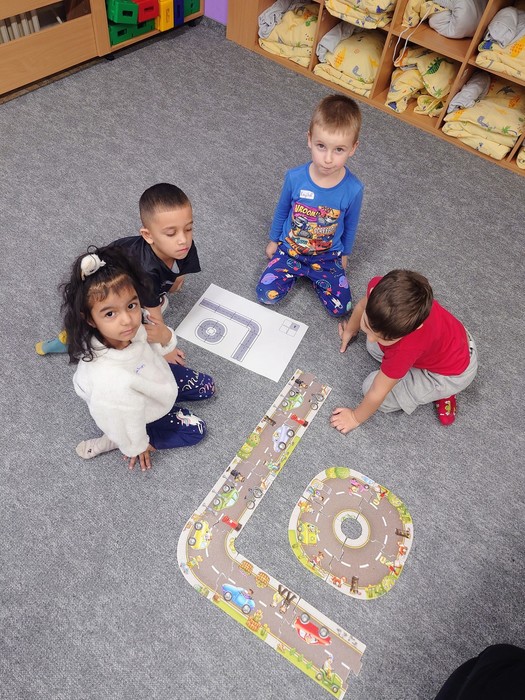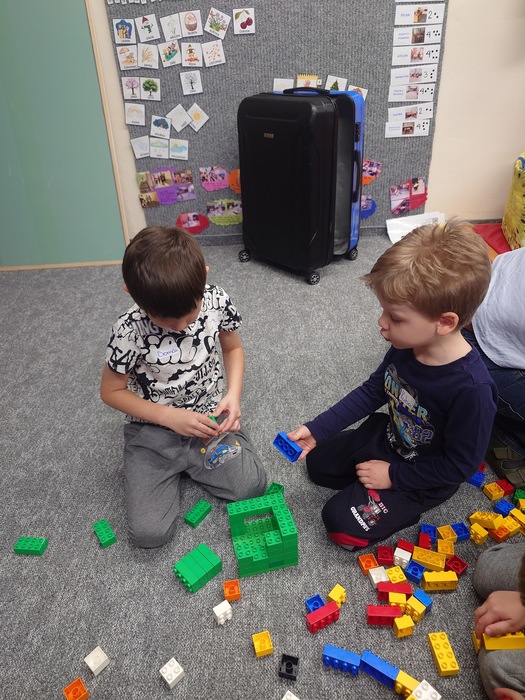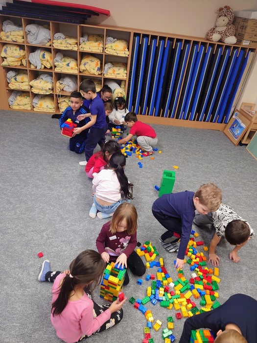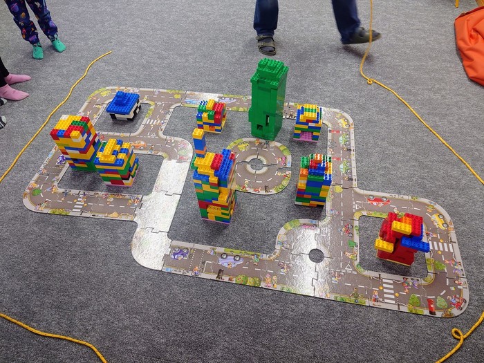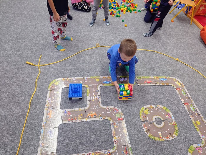 Začali jsme stavěním cest, kdy každá skupinka stavěla cesty podle plánku, který dostala. Když měli všichni hotovo, jednotlivé cesty se spojily v jednu velkou cestu kolem města. Každá skupinka si potom vybrala, jakou budovu bude stavět. A zazněly skvělé nápady. Děti si mohly vyzkoušet roli skutečných stavitelů a z LEGA se stavělo kino, školka, panelák, nemocnice, obchody a policejní stanice... Nesmělo se samozřejmě zapomenout na to, co taková stavba má mít. Takže všechny stavby měla zdi, okna, dveře a střechy.