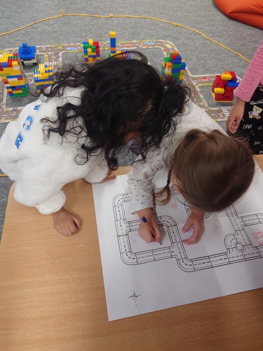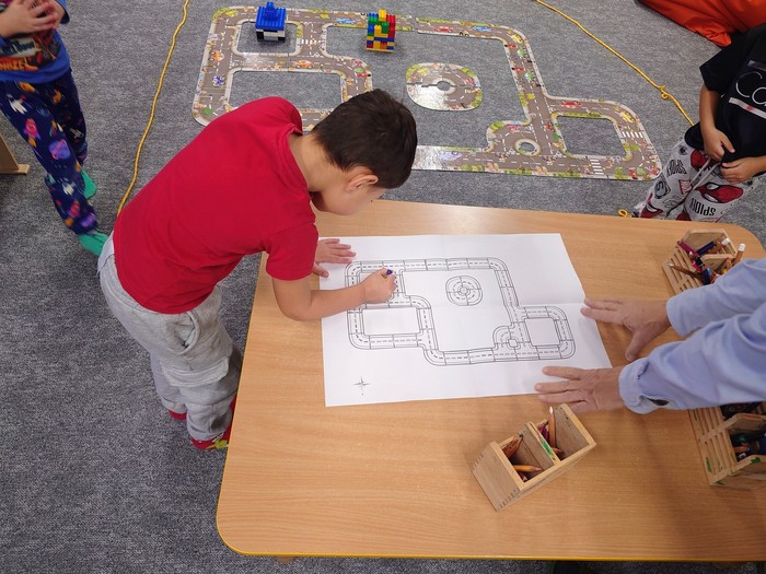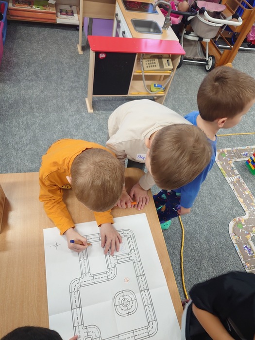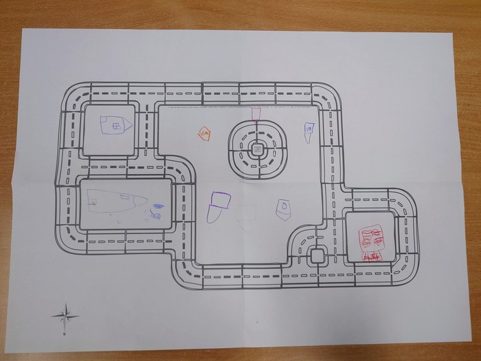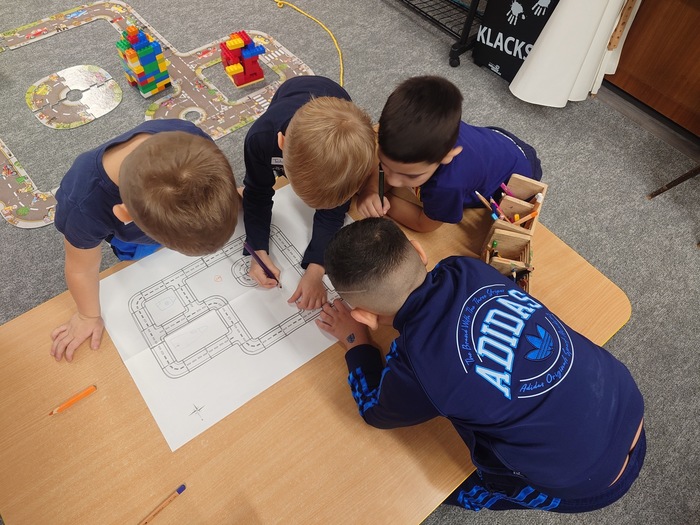 Další úkol byl jasný. Postavit stavby do našeho města. Děti si je postavily, kde chtěly ale potom si je musely nakreslit do plánku města. Ale i to pro naše děti nebyl žádný problém.