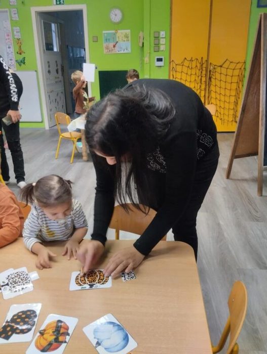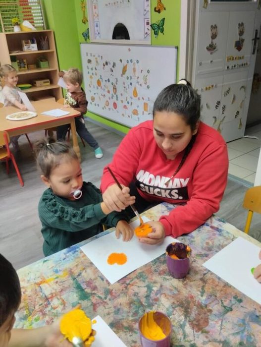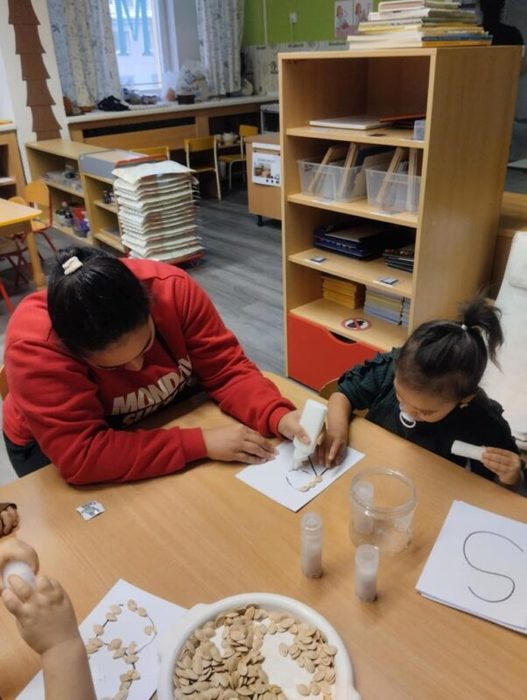 V dalším týdnu jsme měli téma Podzim maluje, kde jsme se zaměřili na barvy, které se na podzim v přírodě vyskytují. Měsíc říjen jsme zakončili tématem Čas dýní, kde jsme si ozdobili začáteční písmena jmen semínky z dýně, namalovali jsme si pomocí obtisku jablek dýně na papír, v pohybu jsme kutáleli dýni mezi kužely a další aktivity spojené s dýňováním.