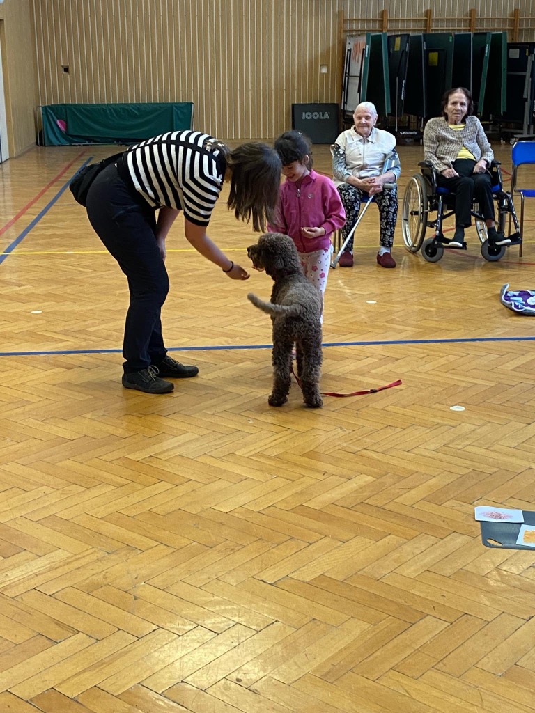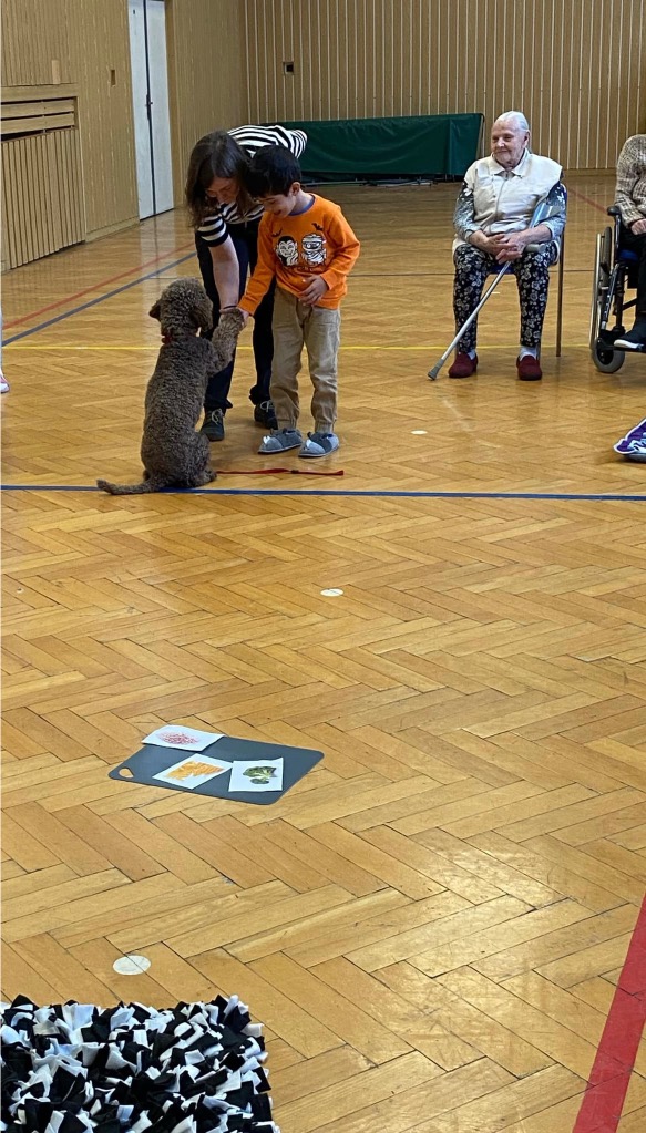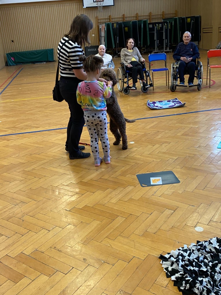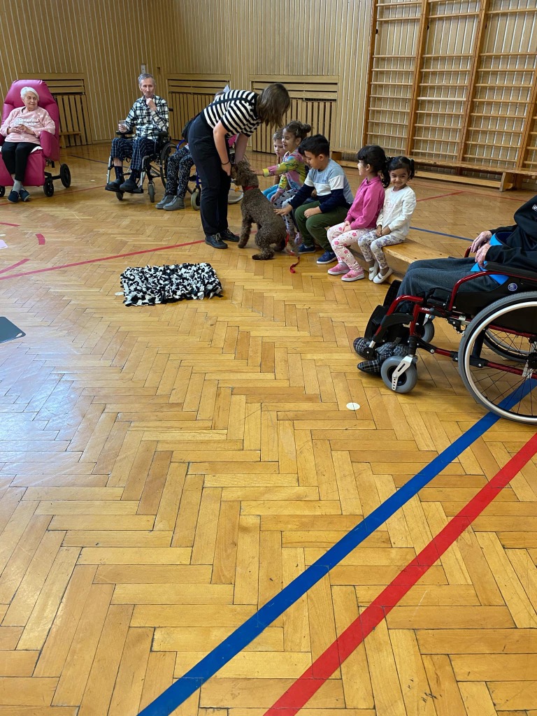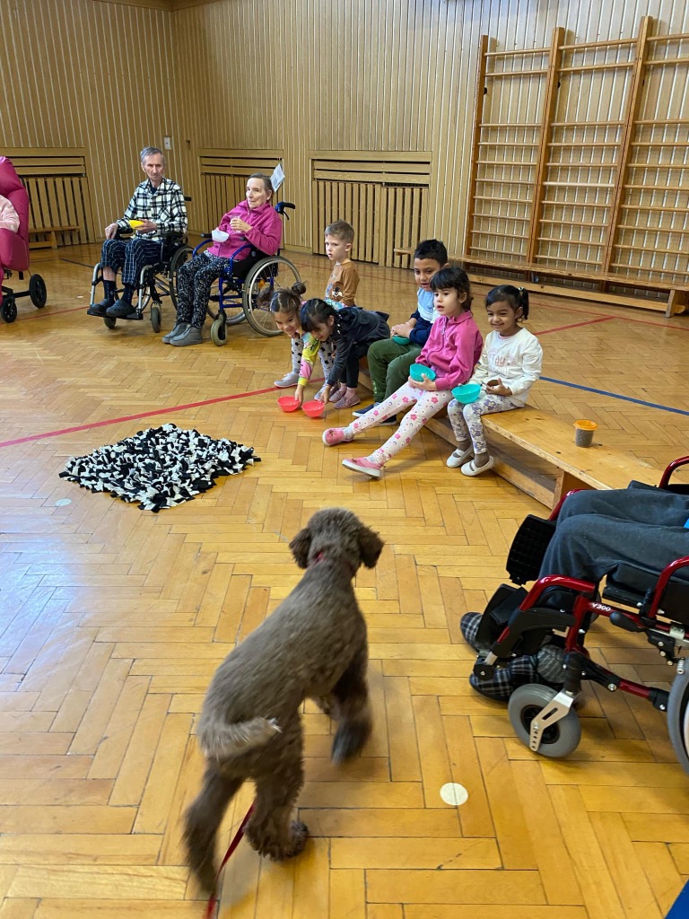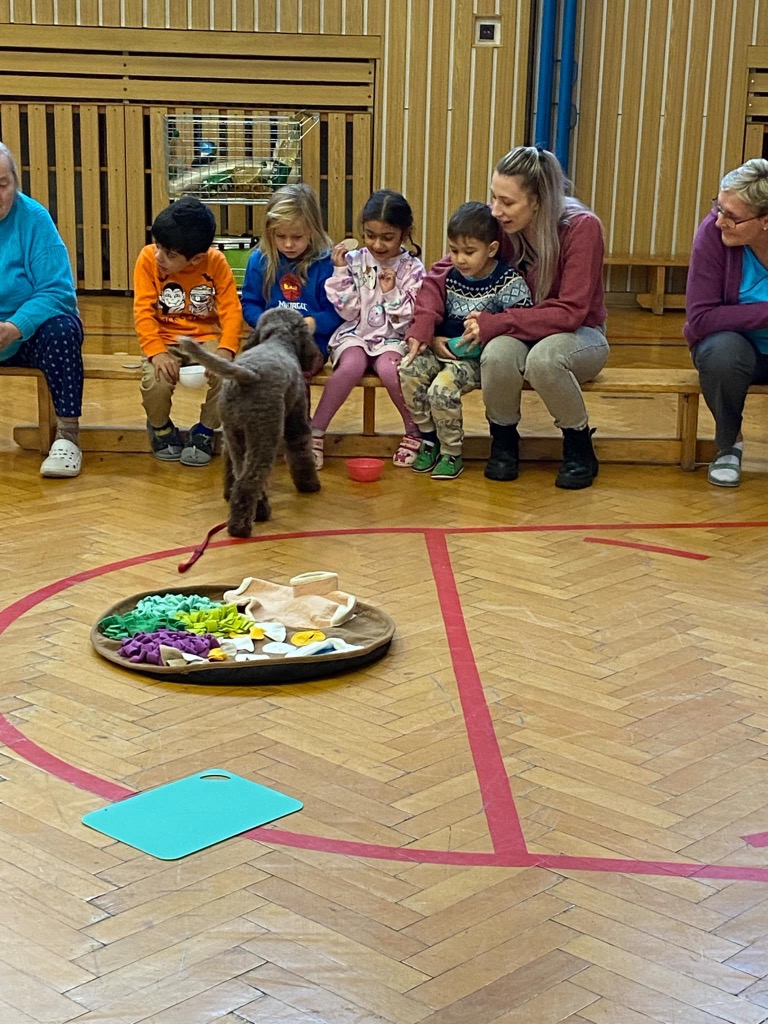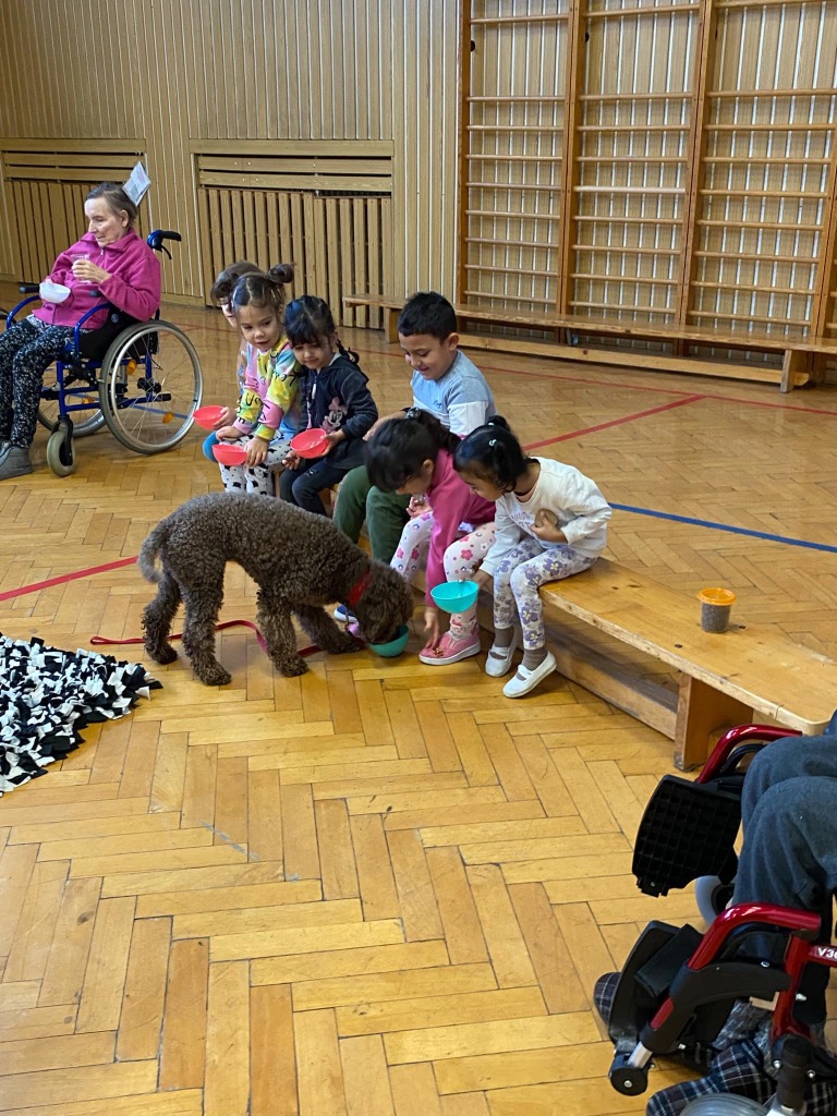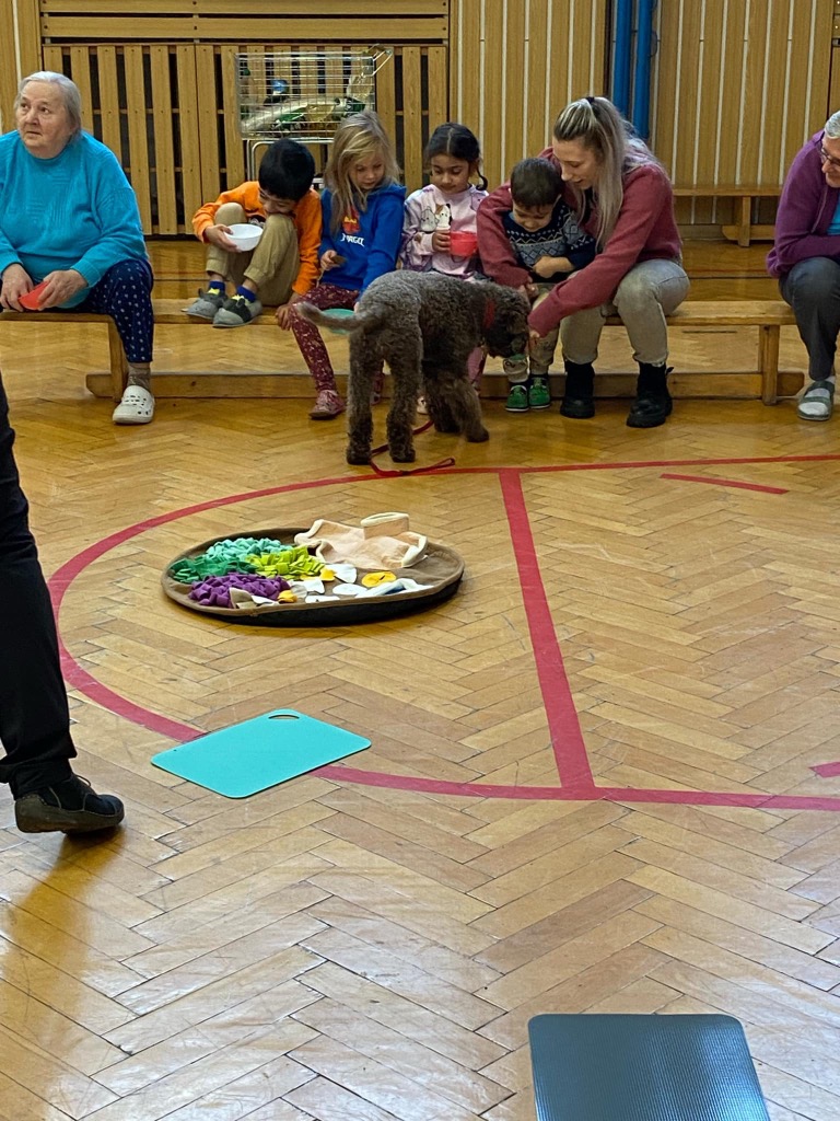 . Pro děti byla připravená ukázka toho, co takový pejsek všechno dokáže – povely SEDNI, LEHNI, DEJ PAC, dokonce i vyřešit hlavolam a získat tak oblíbené granule. S dětmi jsme si tento společný čas moc užili a budeme se těšit zase na příště.