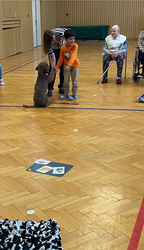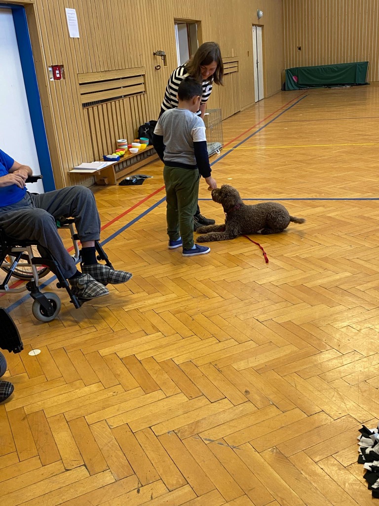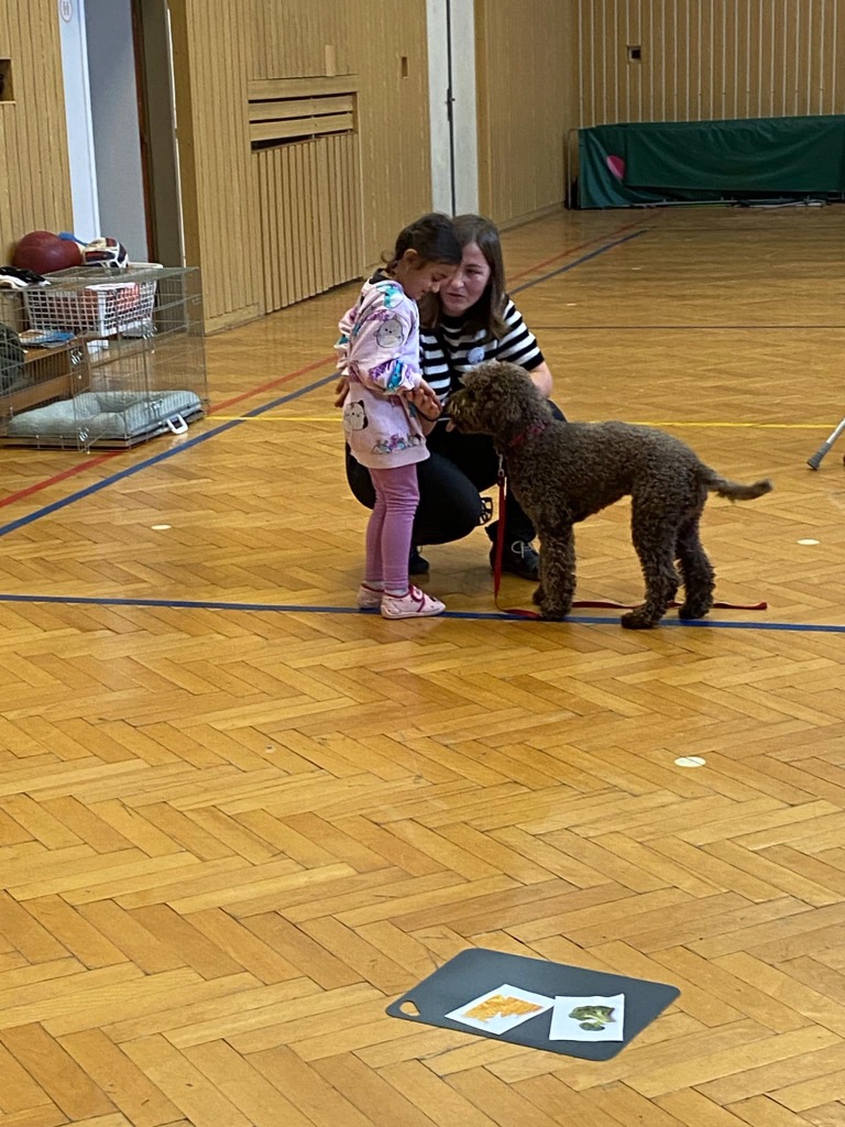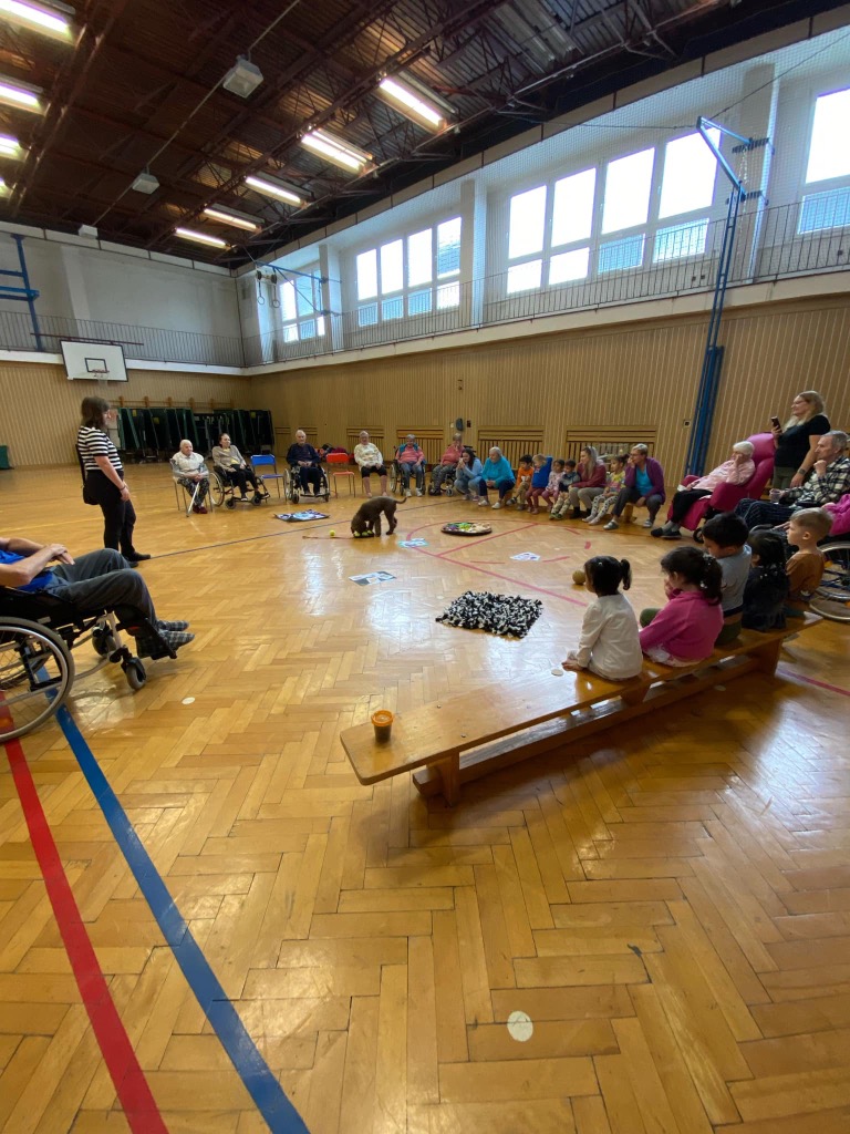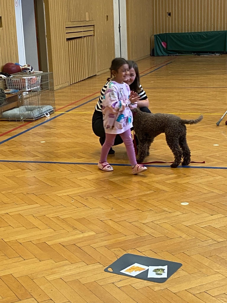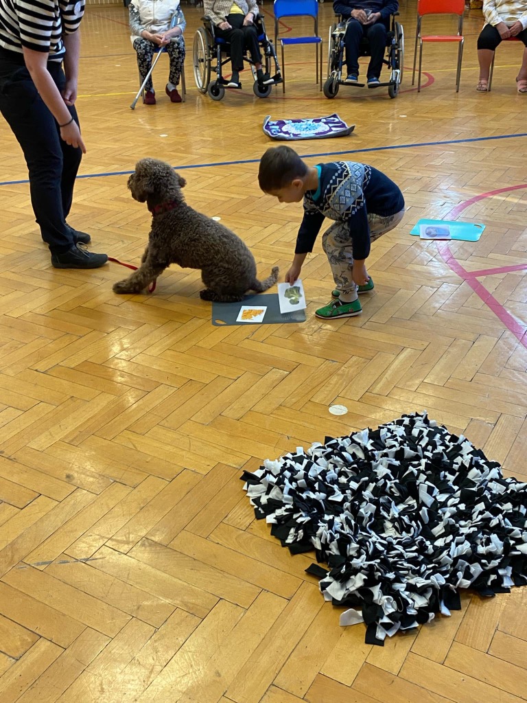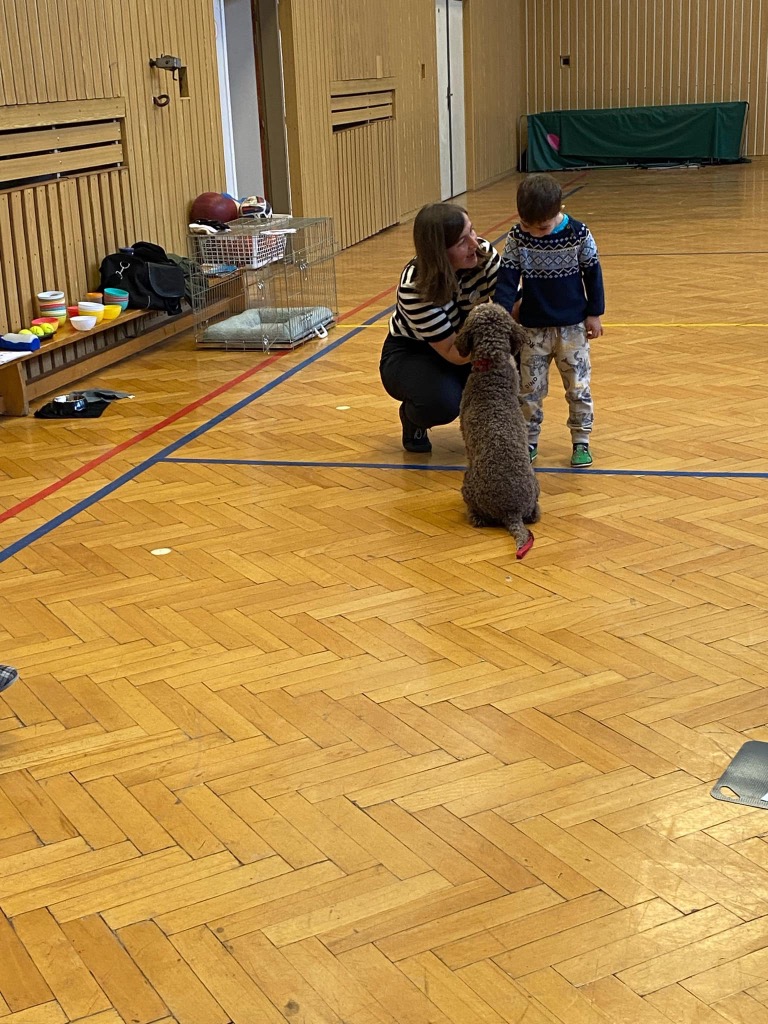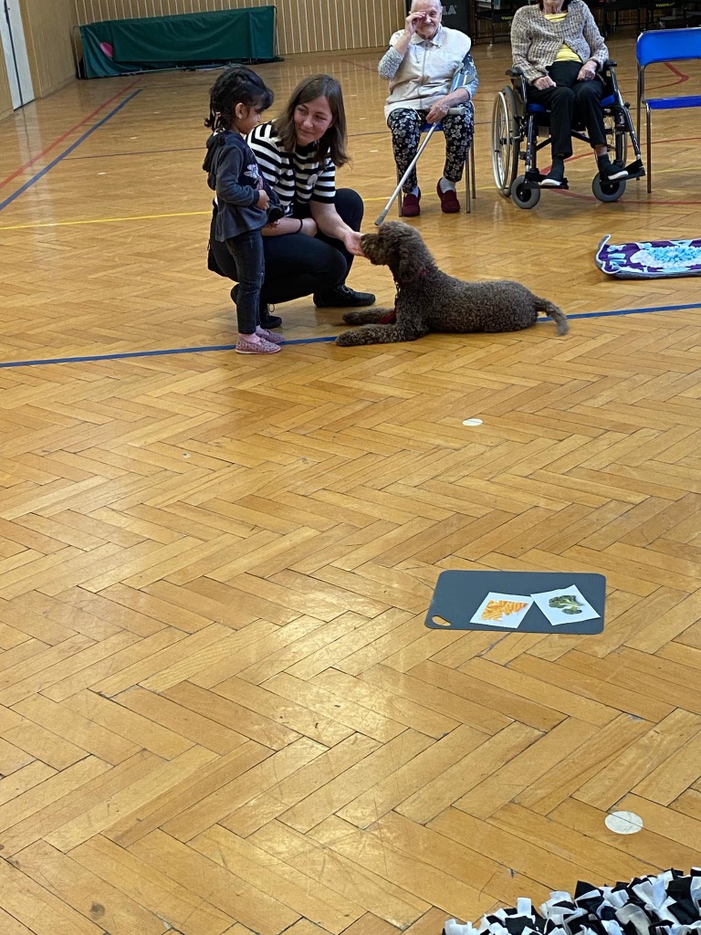 . Pro děti byla připravená ukázka toho, co takový pejsek všechno dokáže – povely SEDNI, LEHNI, DEJ PAC, dokonce i vyřešit hlavolam a získat tak oblíbené granule. S dětmi jsme si tento společný čas moc užili a budeme se těšit zase na příště.