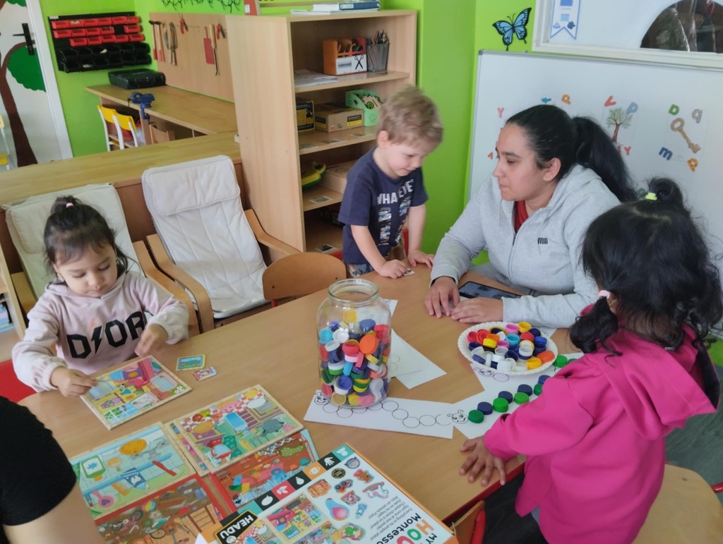 Děti si hrály na motýlka 🦋 a hledaly cestu bludištěm k jeho sladkému nektvaru. Vytvořily si cyklus vývoje motýla od housenky 🐛 po motýla 🦋za pomoci papíru a vaty. Také si vyzkoušely třídit papírové motýly podle barev a stavěly jim malý domeček.