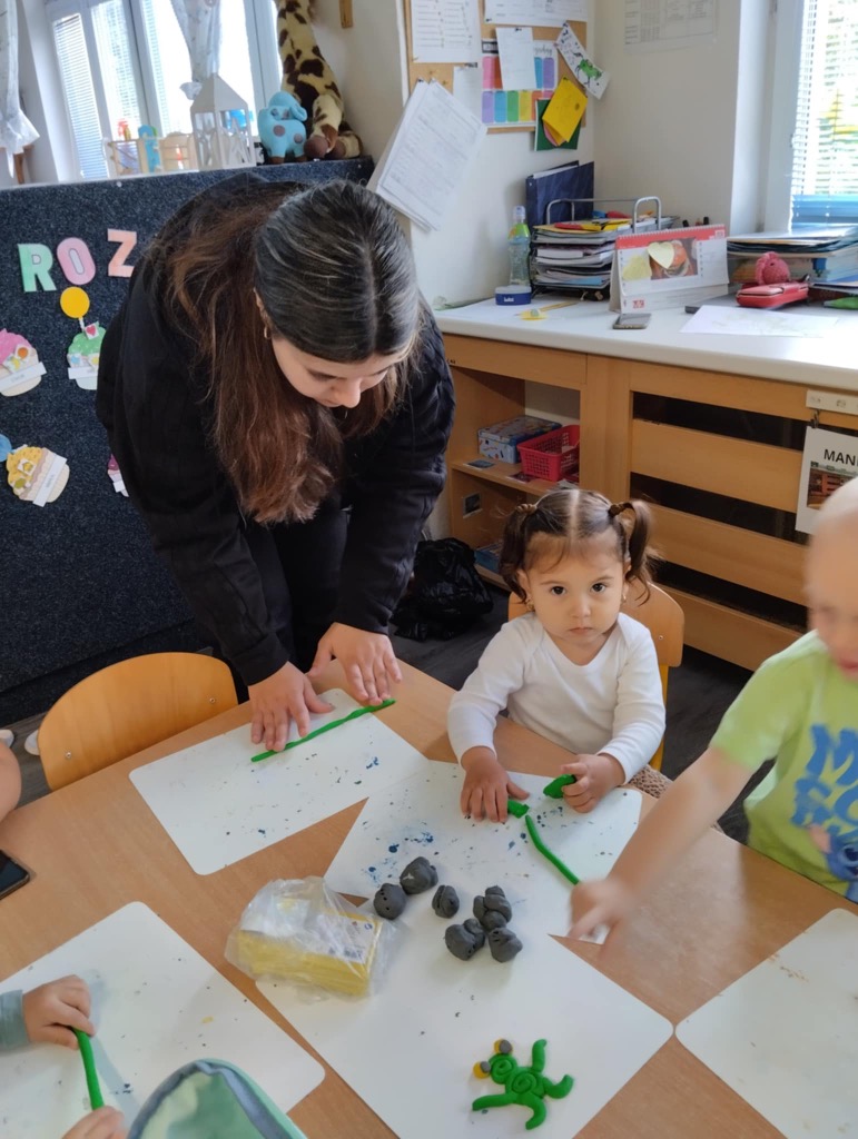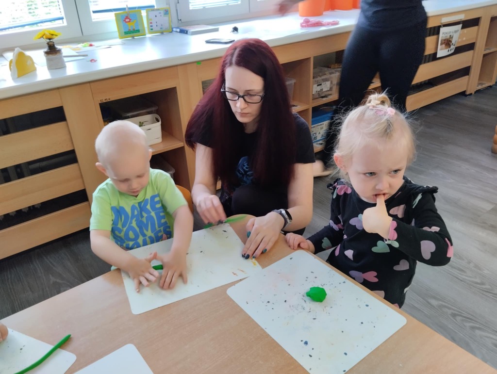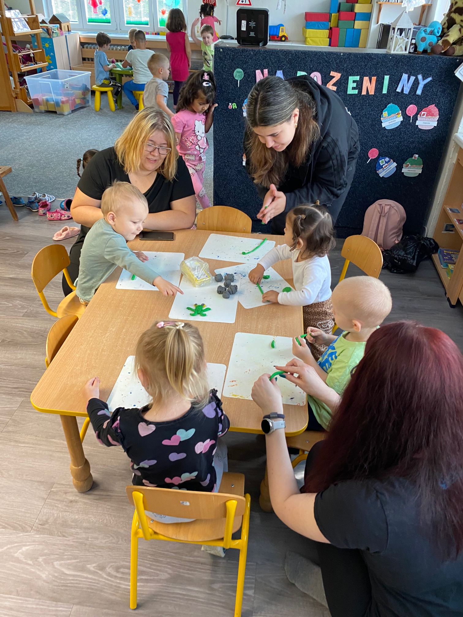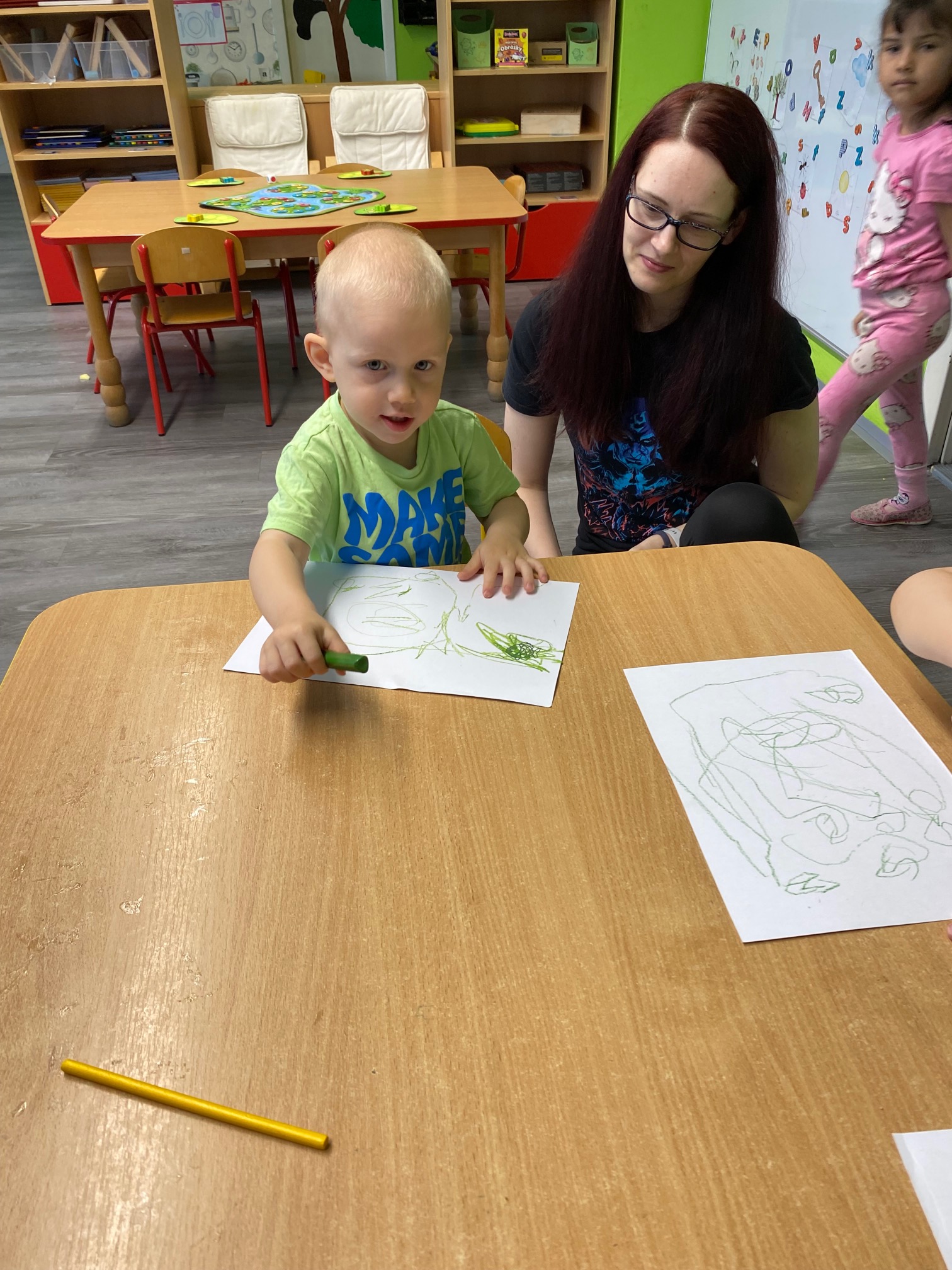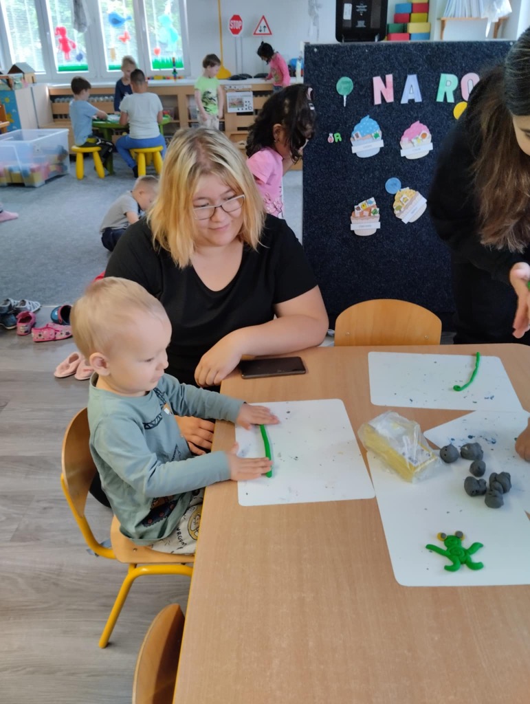 V ranním kroužku jsme si zazpívali písničku Holka modrooká a povídali si o tom, jaká zvířátka žijí v rybníce. Zaměřili jsme se na žáby 🐸– děti je kreslily na papír a modelovaly z plastelíny.