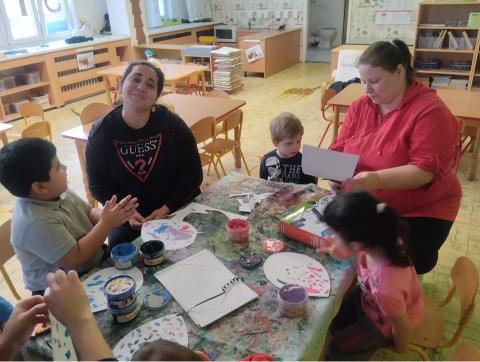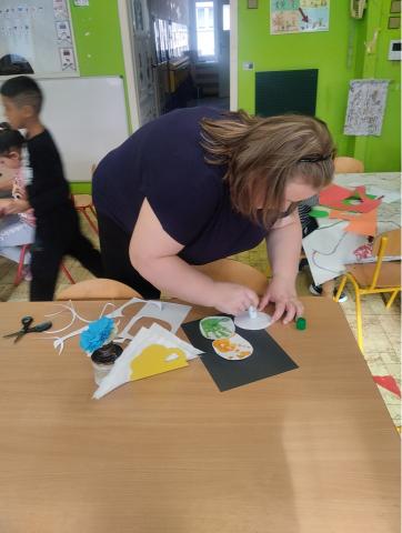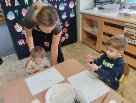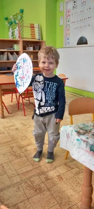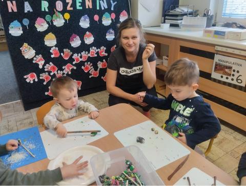 , které jsme ozdobili pomocí prsových barev. V manipulativech jsme si vymodelovali a ozdobili koláč