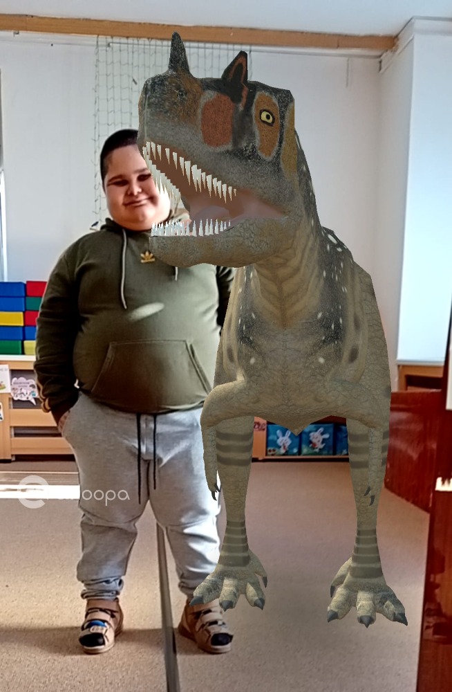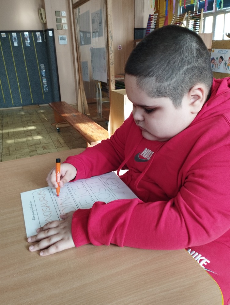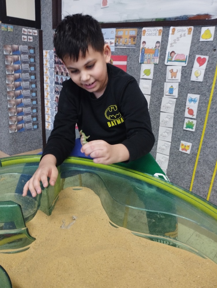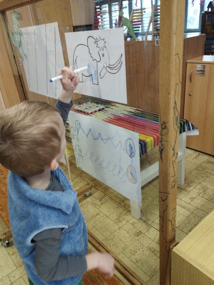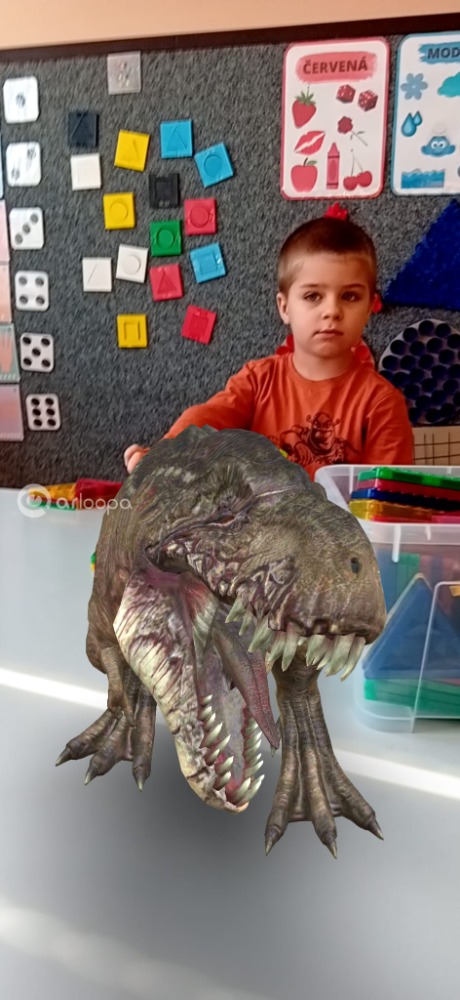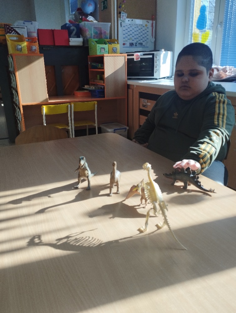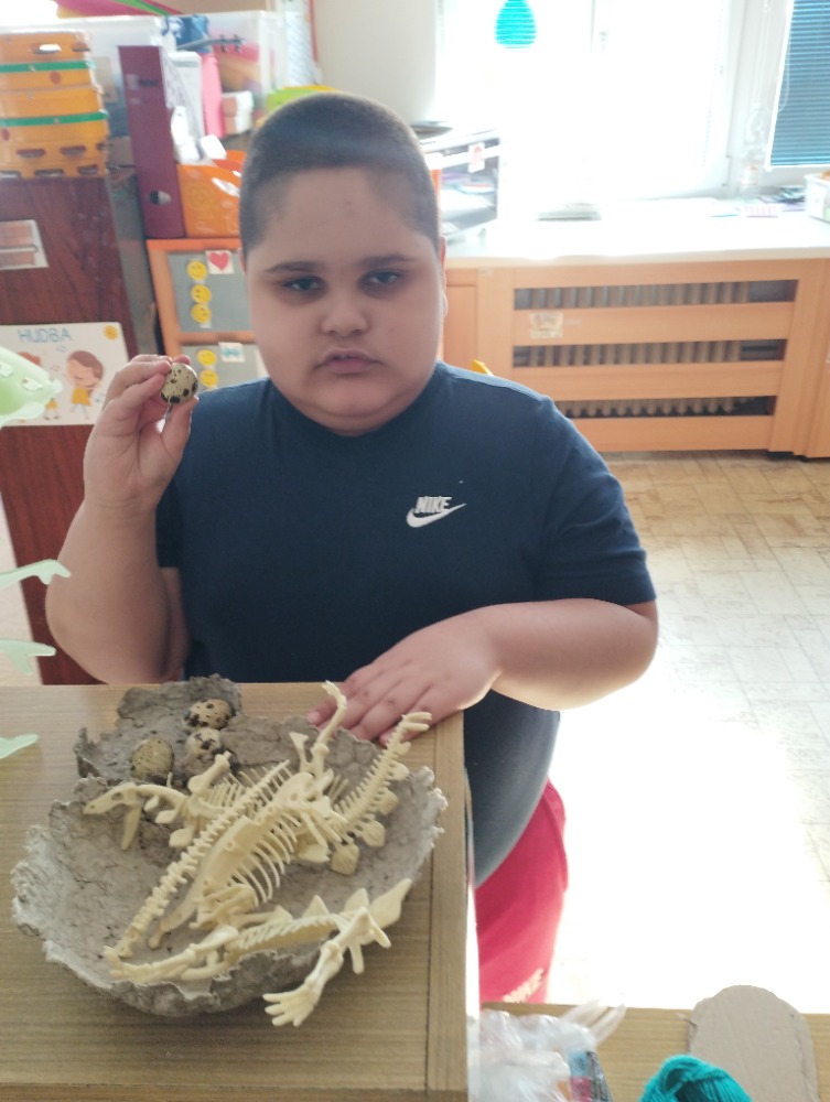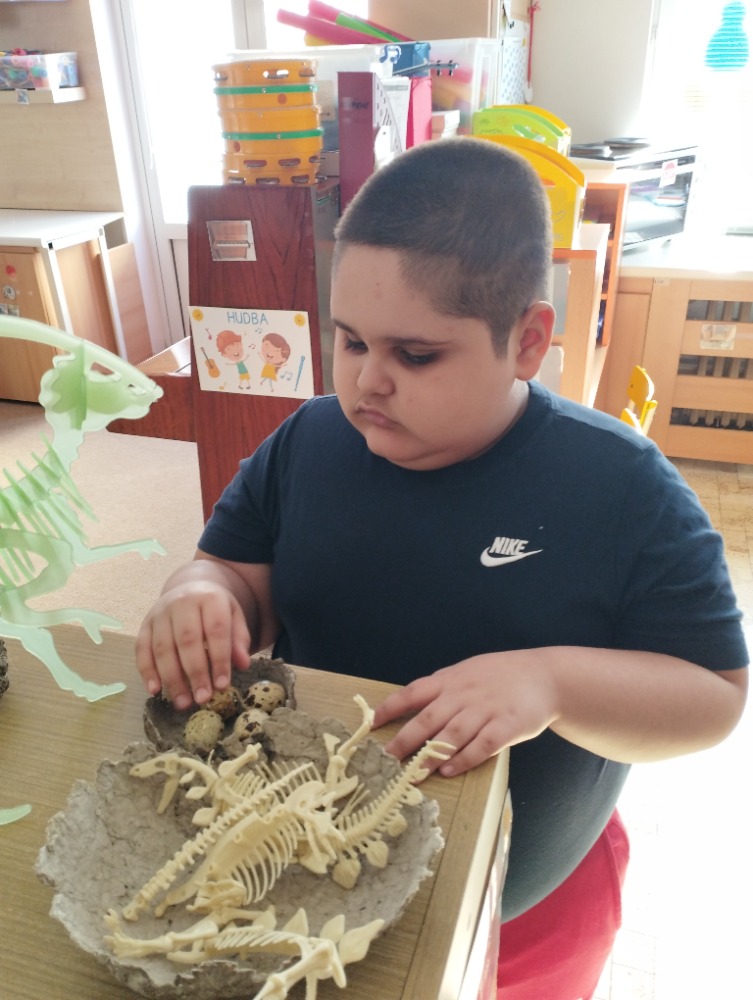Tento týden jsme se vydali s dětmi po stopách dinosaurů. Ukázali jsme si na demonstračních obrázcích jak vypadají dinosauři a poslechli jejich zvuky. Děti si vyzkoušely jak se v takových dinosauřích tlapách chodí, zahrály si na archeology – hledaly kosti dinosaurů v písku, vyrobily dinosaura ve vajíčku, jeho stopu, vyzkoušely stínohru s dinosaury a spoustu dalších činností. Děti prozkoumaly zahradu a také nechyběla procházka. Ve třídě nás navštívili dinosauři se kterými nemohla chybět fotka 😊