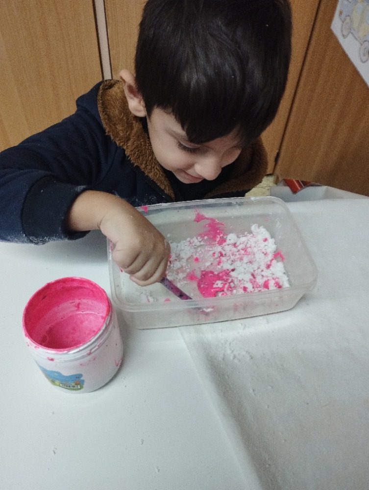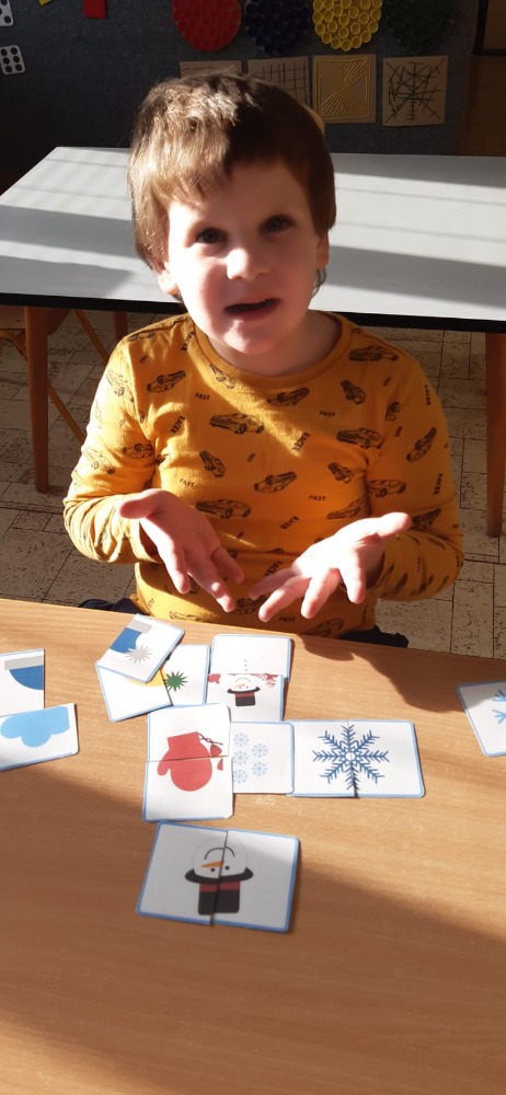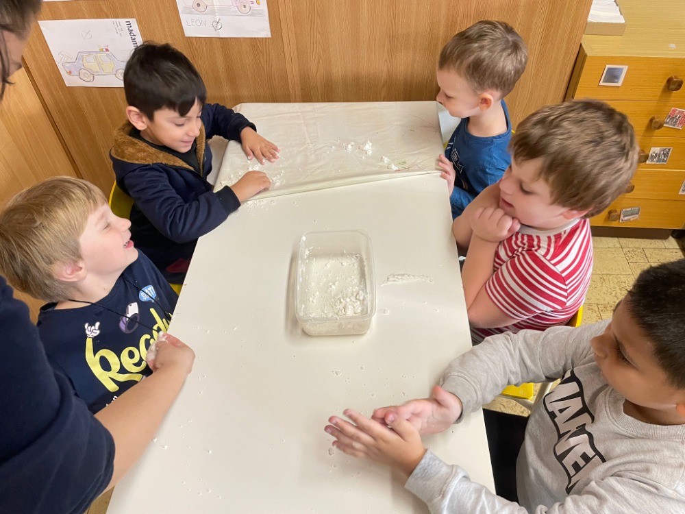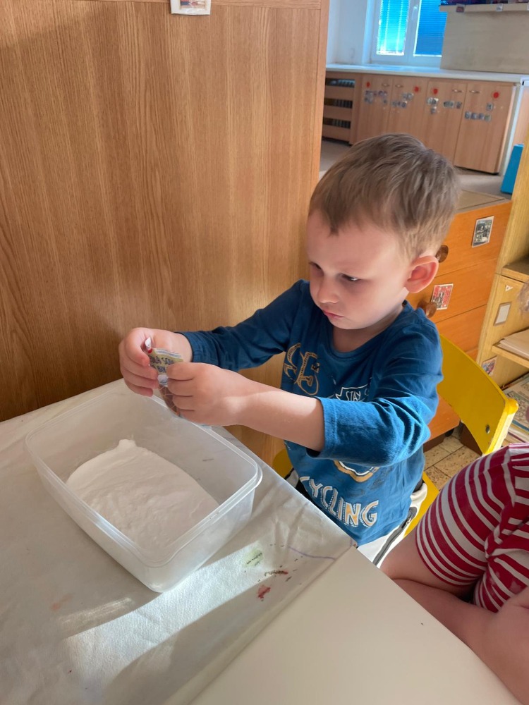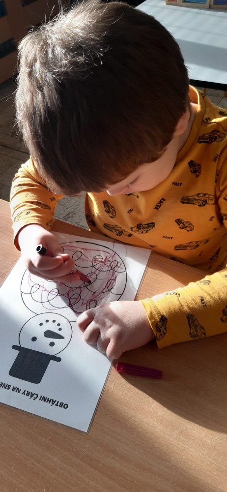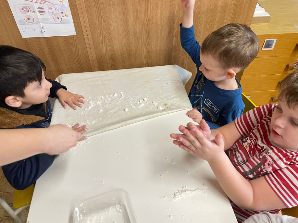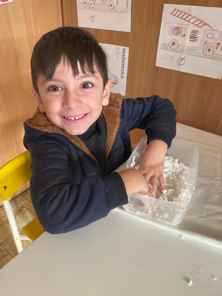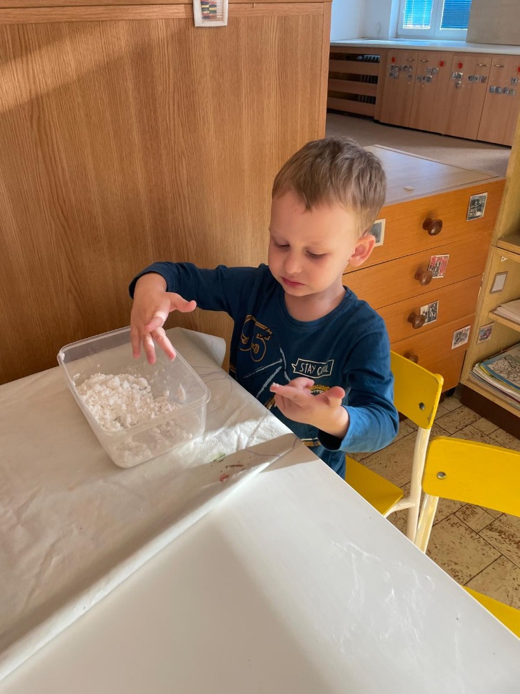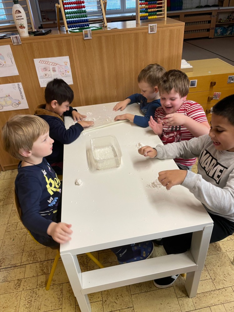 Dalším naším tématem byla Zima. S dětmi jsme si vyrobily hrníček na čaj, upekly si zimní skořicové sušenky a protože nám ještě nenapadl venku sníh, děti vyrobily svůj sníh, ze kterého mohly postavit sněhuláka 😊 a neměly zmrzlé ruce 😊 Také si děti vyrobily sněhové koule se kterými si následně zahrály bitvu 😊 Zahrály si na bubínky a vyzkoušely hru na triangl a spoustu dalších aktivit a činností. Nezapomněly si hrát a relaxovat. Zkrátka si užily zimu jak se patří 😊