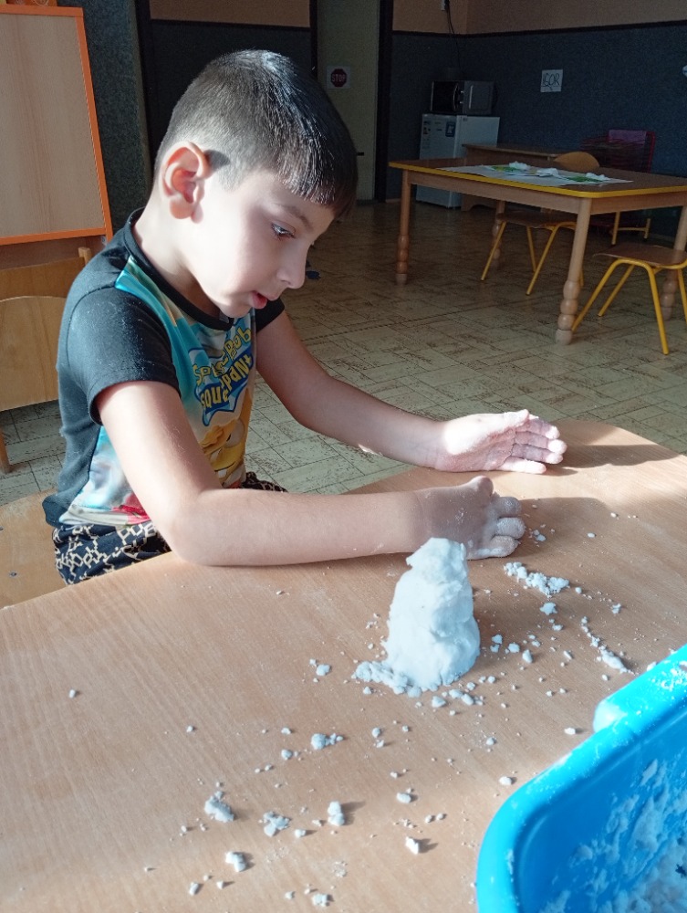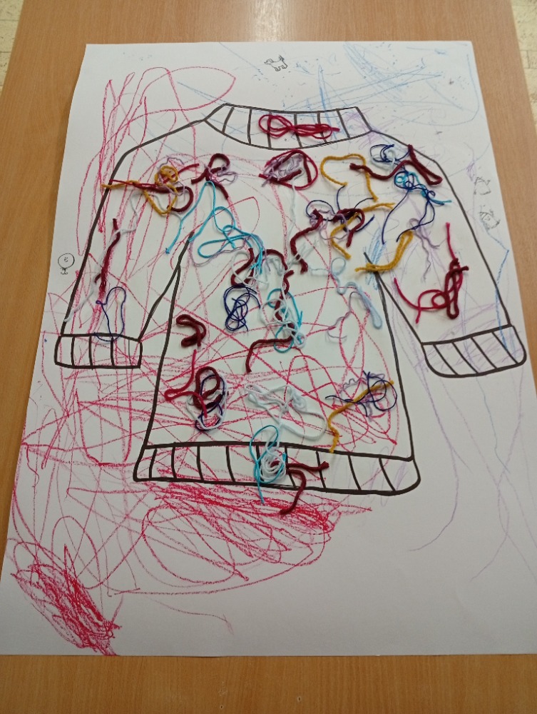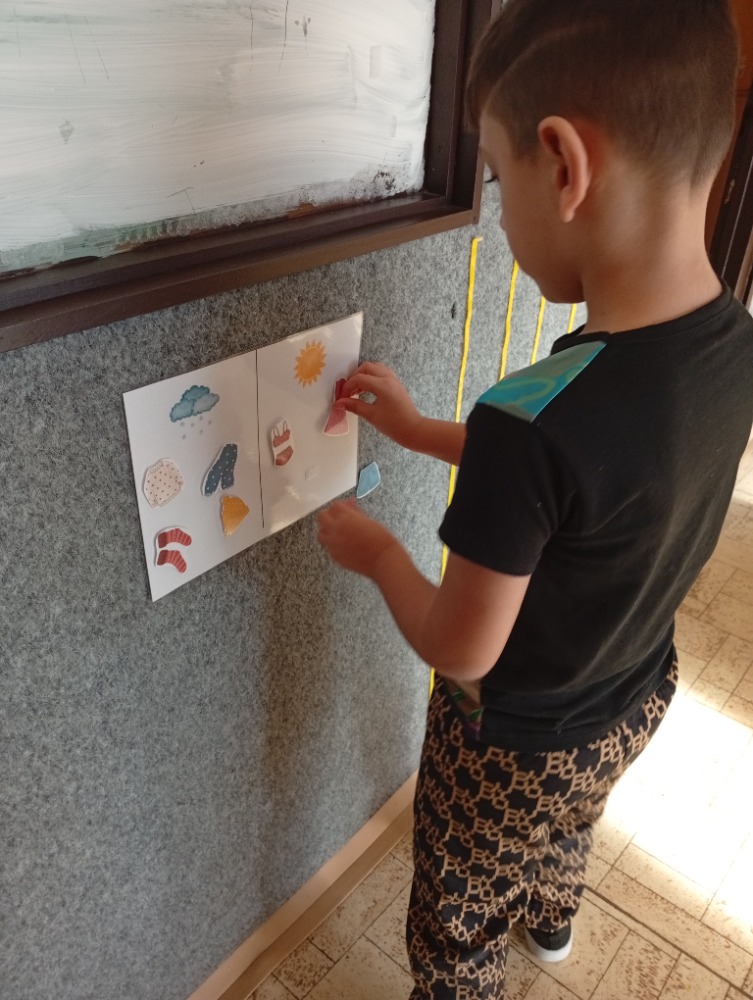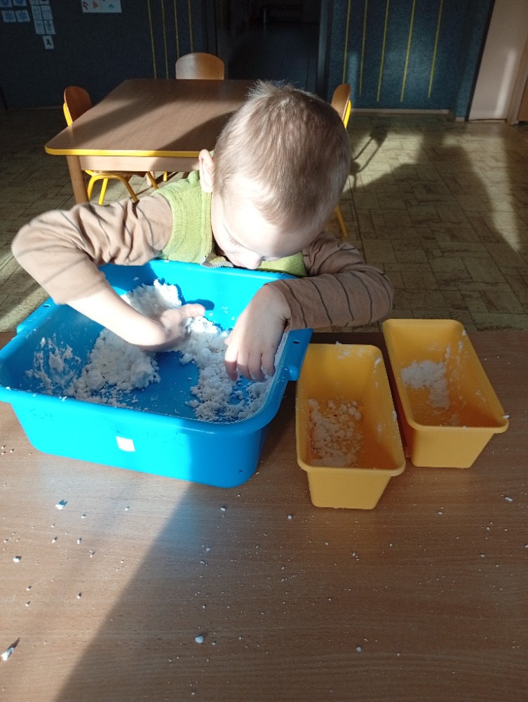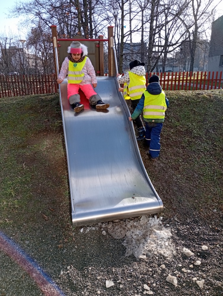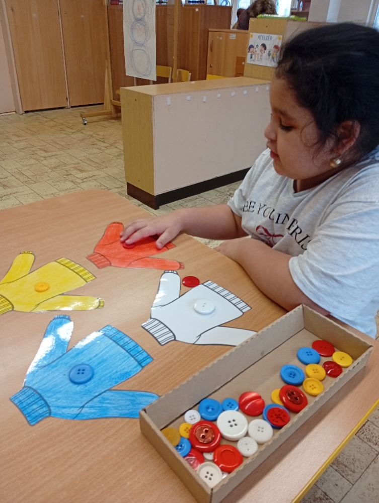 Zimní oblečení, to bylo další téma, které nás s dětmi čekalo. Děti přiřazovaly barvy, třídily zimní oblečení, zkusily si ho také pověsit, pracovaly s různým materiálem (bavlnou, vlnou, vatou, krepovým papírem), počítaly knoflíky, vyráběly sníh a také ho zkusily obarvit, prošly hmatovým chodníčkem, překážkovou dráhou… Také hrály na hudební nástroje, kterými vyjádřily zimu. Nezapomněly si hrát, relaxovat a navštívit saunu. Počasí nám přálo a tak mohly děti prozkoumat zahradu MŠ.